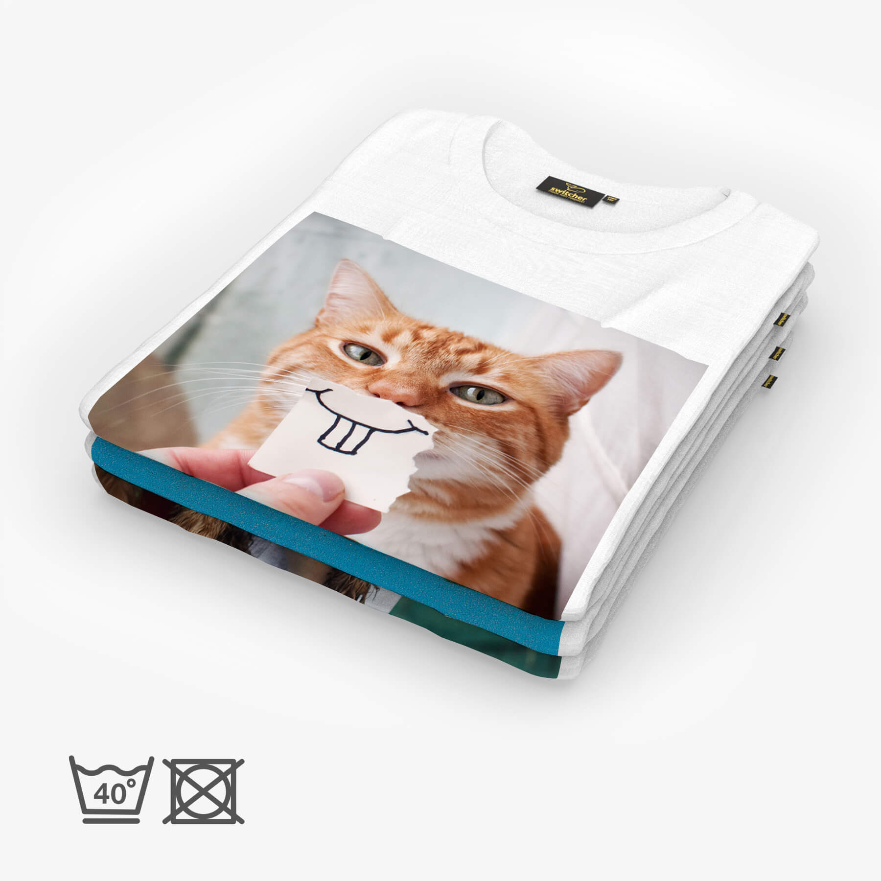 Für die Gestaltung deines ifolor Foto T-Shirts stehen dir verschiedene Vorlagen zur Verfügung – perfekt für diverse Anlässe. Wähle die Vorder- oder Rückseite deines T-Shirts aus und wir drucken dein Bild direkt auf die textile Oberfläche, statt eine Fotofolie oder Transfer zu verwenden. Der Vorteil davon? Ein angenehm weiches Tragefühl bei bester Bildqualität deines Fotos auf dem T-Shirt. Der Druckbereich auf deinem Foto T-Shirt ist je nach T-Shirt Grösse und Design bis zu 305x406 mm gross. In diesem werden Konturen, Farbverläufe sowie Kontraste dank speziellem Textil-Direktdruckverfahren scharf und fotorealistisch abgebildet.