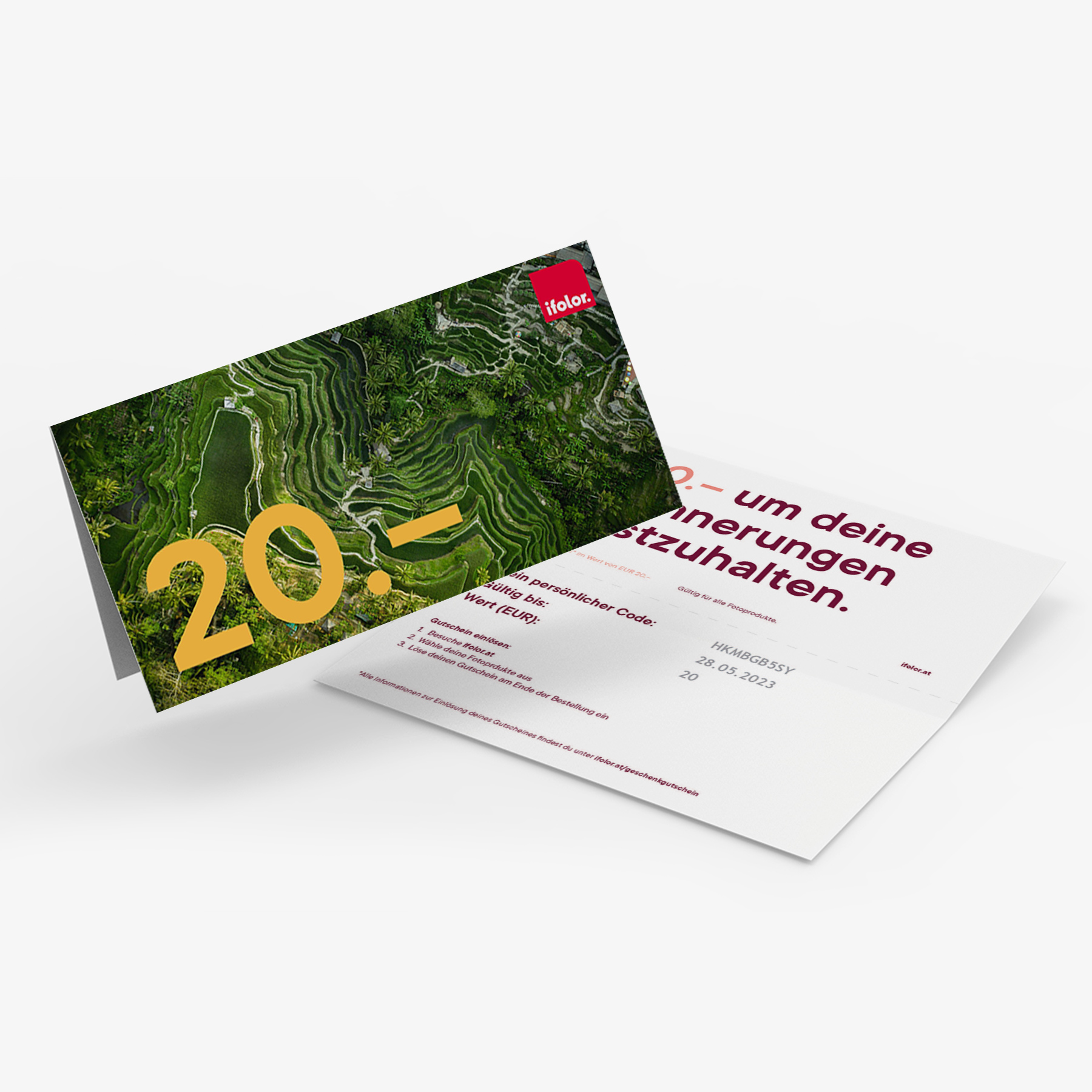 Den ifolor Gutschein erhältst du im edlen 20x10 cm Grusskarten-Look. Auf den Innenseiten kannst du sogar noch ein paar persönliche Worte an den Beschenkten richten. Damit du ihn stilvoll überreichen oder auch per Post an deine Lieben verschicken kannst, senden wir dir auch gleich einen passenden Umschlag mit dazu.