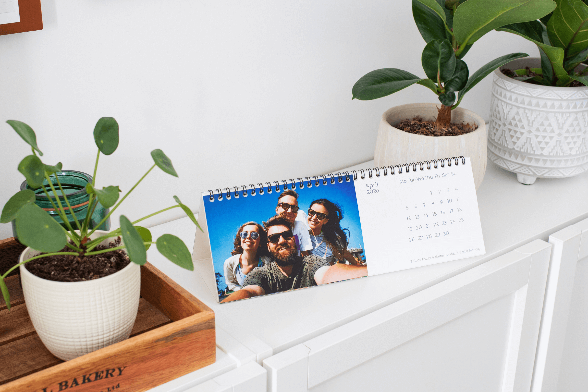 Auf dem Schreibtisch oder im Küchenregal in Sichtweite ist der ifolor Tischkalender die perfekte Lösung, um den aktuellen Monat immer im Blick zu haben. Dank des stabilen Aufstellers kannst du den Tischkalender überall platzieren, wo du ihn gut im Blick hast. Gestaltet mit schönen Erinnerungsfotos von den letzten Ferien, unvergesslichen Familienausflügen oder deinem Haustier ist dein selbst gestalteter Tischkalender obendrein eine tolle Motivation am Arbeitsplatz.