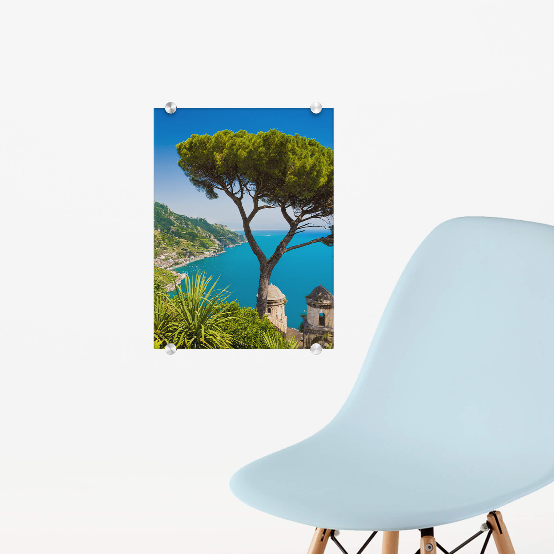 YDie Acrylglasplatte bringst du mit Hilfe der mitgelieferten Spezialaufhängung an der Wand an. Die vier silbernen Halterungen sorgen nicht nur für den tollen Schwebeeffekt, sondern sind auch von vorn sichtbar und verleihen eine elegante Note.