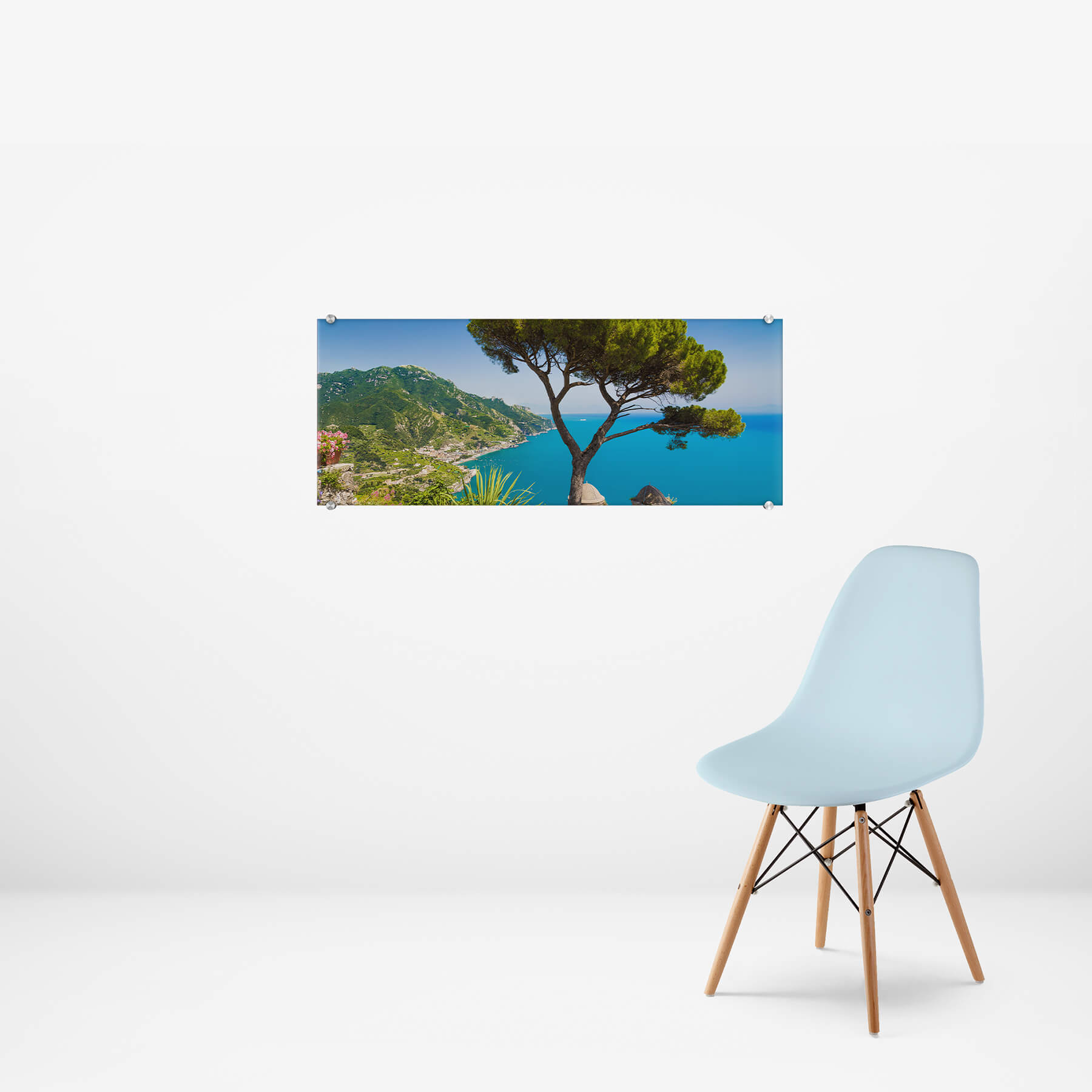 YDie Acrylglasplatte bringst du mit Hilfe der mitgelieferten Spezialaufhängung an der Wand an. Die vier silbernen Halterungen sorgen nicht nur für den tollen Schwebeeffekt, sondern sind auch von vorn sichtbar und verleihen eine elegante Note.